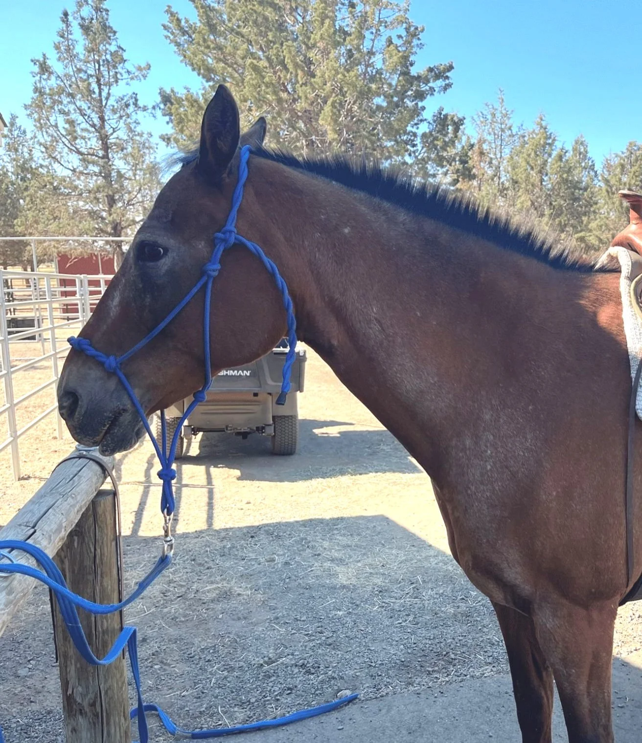 Saved from a dire end from auction in October 2022, this grey quarter horse mare is about 7 years old. Her name has changed to Quinn and she is deeply loved by her new forever family in La Pine!
